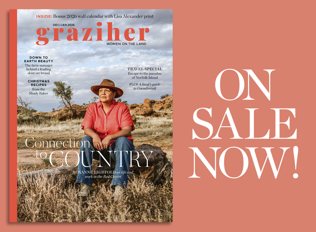 Our cover star is the formidable Roxanne Highfold, an Aboriginal woman who refuses to be defined by the hardships she’s faced. Roxy is on a mission to boost business in Central Australia and give her son choices she never had. This issue features a bonus 2026 wall calendar with a stunning print by Lisa Alexander, plus a rundown of this summer’s best reads. Our Travel Special is packed with off-the-beaten-track destinations and we meet a South Australian farm manager with perhaps the most glamorous job in ag: growing botanicals for luxury skincare products. And with Christmas just around the corner, The Shady Baker presents a collection of beloved family recipes from the Graziher team, including a very special raspberry and amaretto trifle.